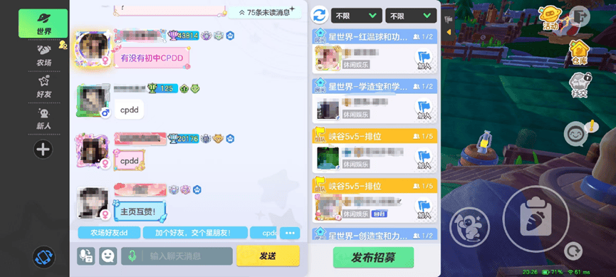 例如在腾讯《元梦之星》的公屏聊天内容中,就出现了大量cpdd的内容,甚至出现了“有没有初中CPDD”相关的表述,如此数量以亲密关系为主要需求的交友信息出现在未成年人账号的公屏讨论中,一旦其中存在怀有不良目的的对象,很可能将会对未成年人的游戏社交产生负面影响。