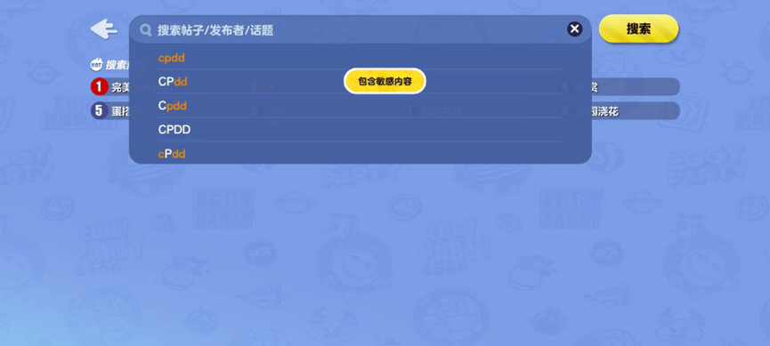 相对较为积极的案例是,一些游戏会将相关发言设置为敏感词或特殊词语,无法在公屏或私信中打出,或对未成年人账号加以屏蔽,例如在《蛋仔排队》内部的游戏论坛搜索功能中,就将cpdd设为敏感内容,无法搜索相关的帖子/发言者/话题。