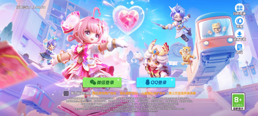 (图说:腾讯《元梦之星》中,开始游戏前要求用户勾选阅读且同意用户协议与隐私政策、第三方信息清单、后方可进入游戏,且右下角适龄提示为8+)
