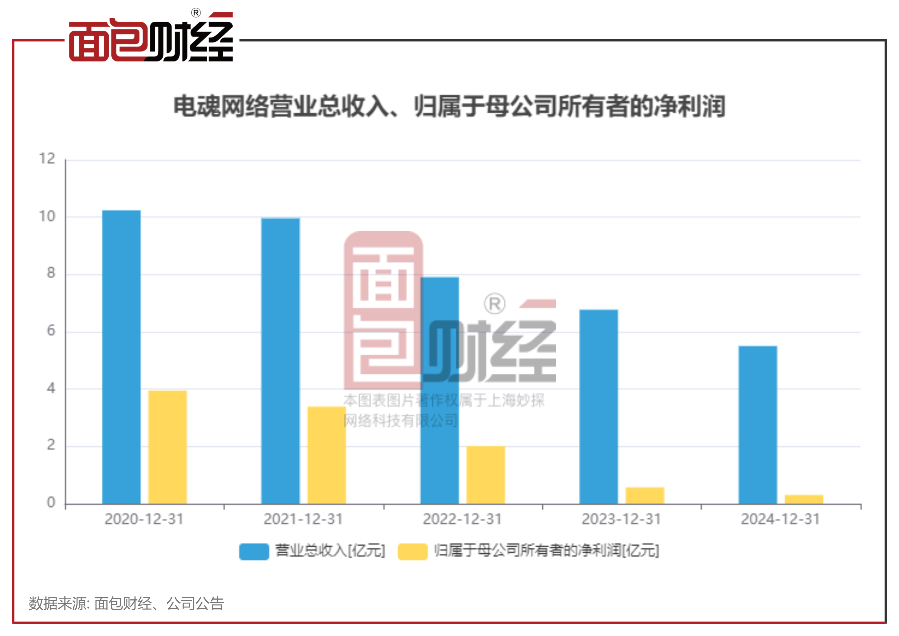 财报显示,电魂网络2024年营收同比下降18.71%至5.5亿元;归母净利润同比下降46.2%至0.31亿元。