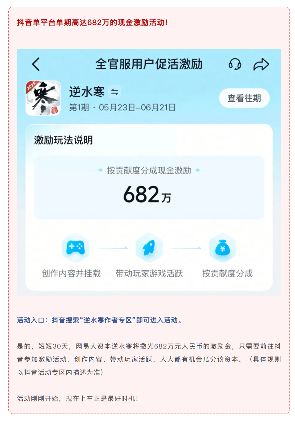 正因为网上风靡的二创,让《逆水寒》手游曝光量惊人,所以机智的官方大手笔拿出682万元,鼓励玩家创作游戏相关内容,这么大的金额,应该是抖音平台游戏赛带最高奖励了吧。
