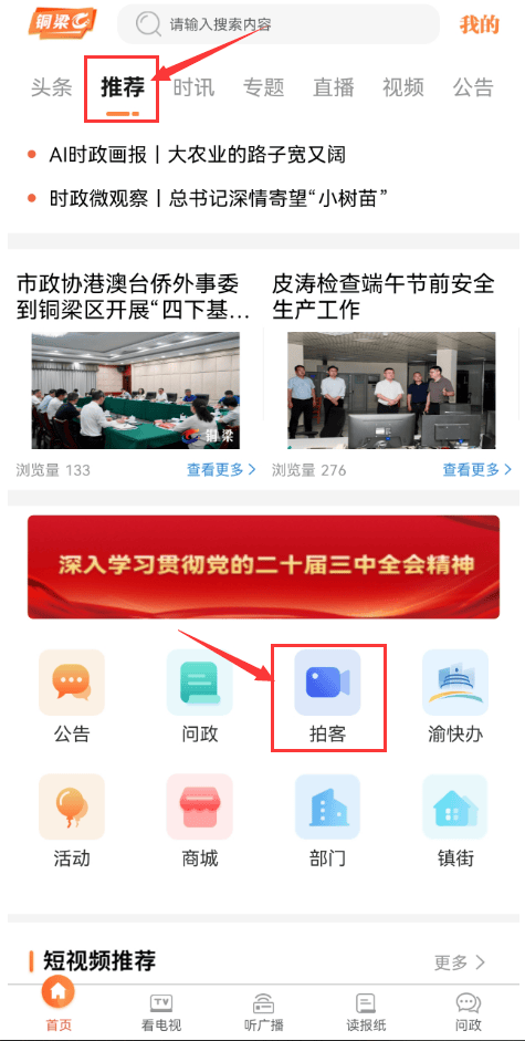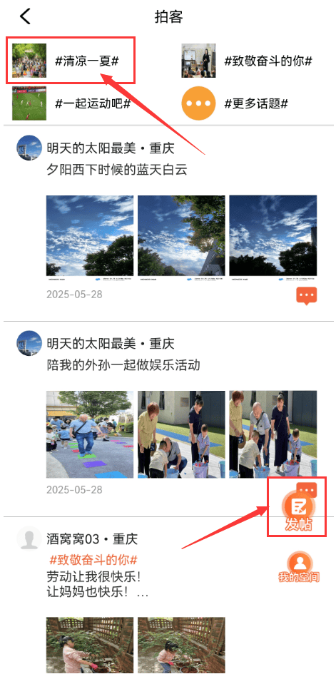 打开“铜梁”APP,进入拍客页面,页面上方显示了可以参与的话题活动,点击进入#清凉一夏#,再进行发帖即可。(PS:必须是要参与话题活动才可以参与评奖哦!)