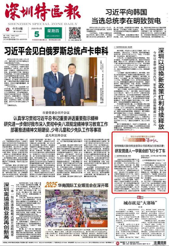 2024年2月,安特狗在深圳正式成立,团队致力于打造普通人学习3分钟即可操控的飞行卡丁车。目前已推出亚洲首款纯电单人飞行卡丁车——AnTG One,自主研发飞行遥感控制系统、安全护航方案等,实现了普通人也能自由翱翔天空的梦想。2024年9月,首个应用场景河南安阳太行山景区飞行俱乐部落地,今年3月完成产品标准化开启量产。该公司首席执行官林志豪感叹:“我们公司之所以发展得这么快,是因为在深圳得到多方扶持,这片热土给予我们实现梦想的机会!”