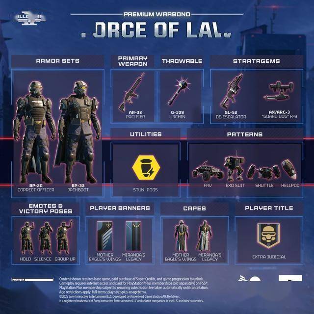 此战备包含三个手势表情:“停下”、“肃静” 和 “集合”。即使麦克风关闭,也能组织小队发起进攻。同时还将引入“法外裁决”称号,授予那些守护并服务于超级地球上的精英。