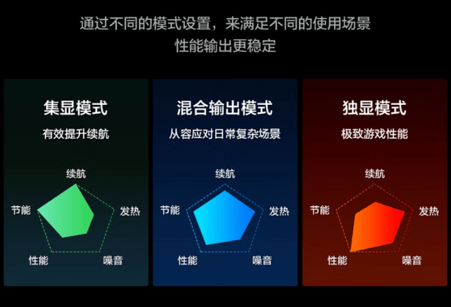 极光X潮玩版游戏本提供了双显三模的运行模式,可在更省电的纯核显模式、性能均衡的混合输出模式与强劲性能的独显模式间任意切换,满足不同场景下对性能和续航时间的需求。