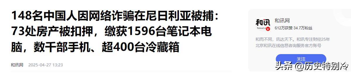 信息来源:和讯网-2025-04-27-《148名中国人因网络诈骗在尼日利亚被捕:73处房产被扣押,缴获1596台笔记本电脑,数千部手机、超400台冷藏箱》