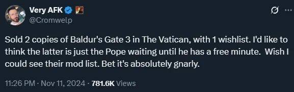 毕竟就连《博德之门3》在梵蒂冈卖出两份时,拉瑞安工作室的发行总监都特意公布了这个喜讯,还不忘顺便提一嘴,除此之外还有第三个梵蒂冈玩家把《博德之门3》加入了愿望单。可见每一份卖出的游戏,在梵蒂冈都算得上一个不大不小的新闻。