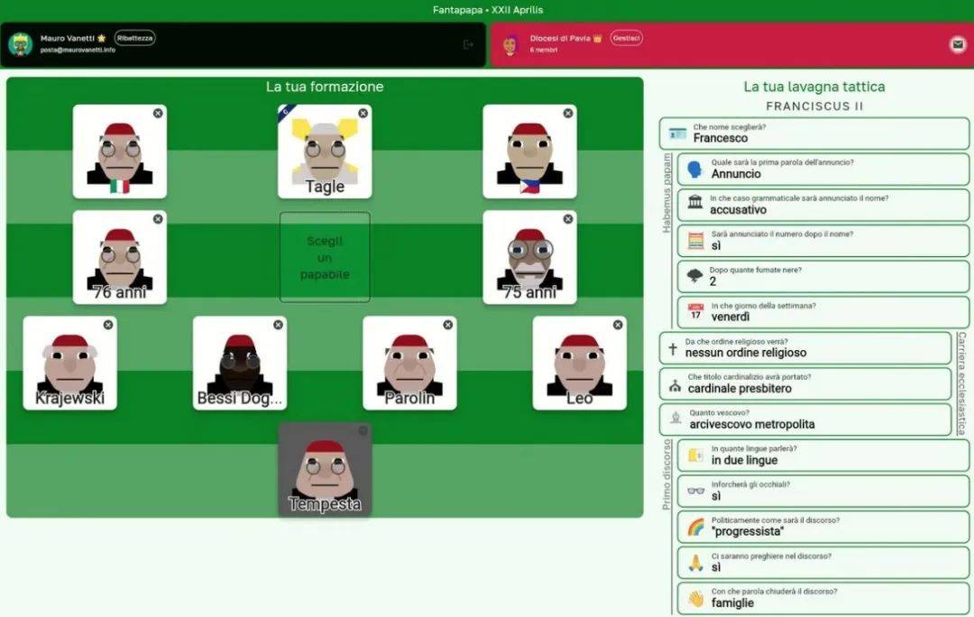 11人的球队对应了11位枢机主教,队长是自己的教皇人选,守门员则是最不可能当选教皇的人选,最后《Fantapapa》会根据所有人的“阵容”,排出教皇选举的“人气榜”。目前已经有超过7万意大利人以足球游戏的形式,间接参与到了教会最重要的仪式中。