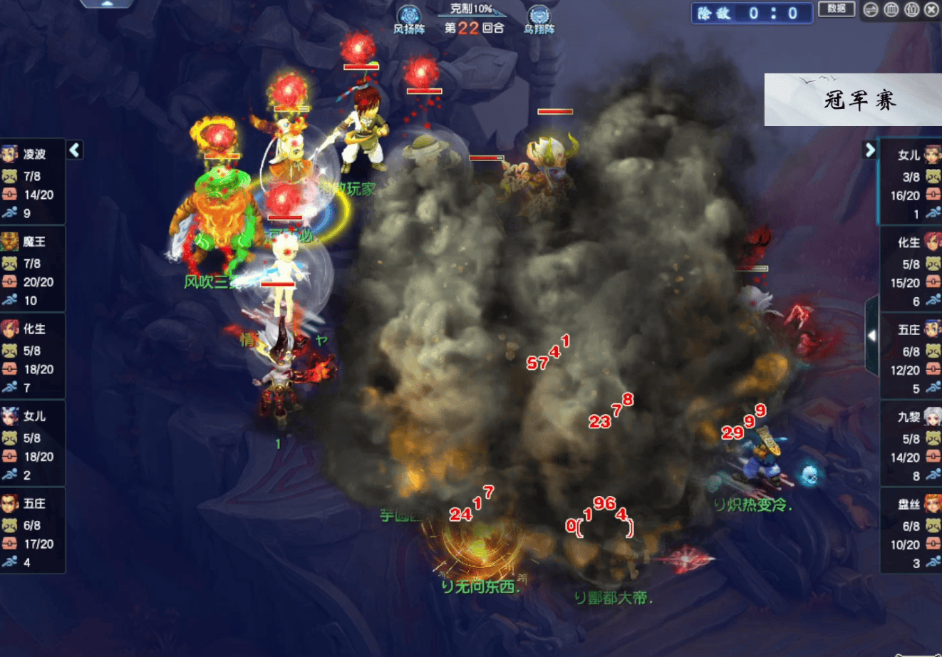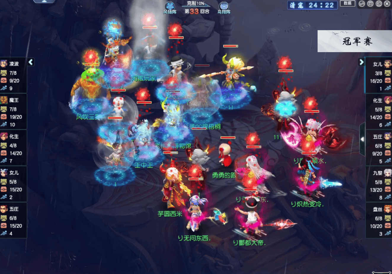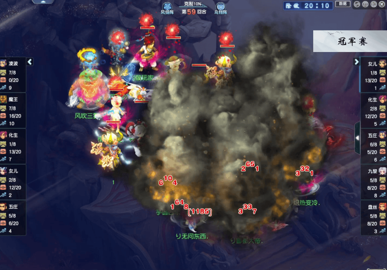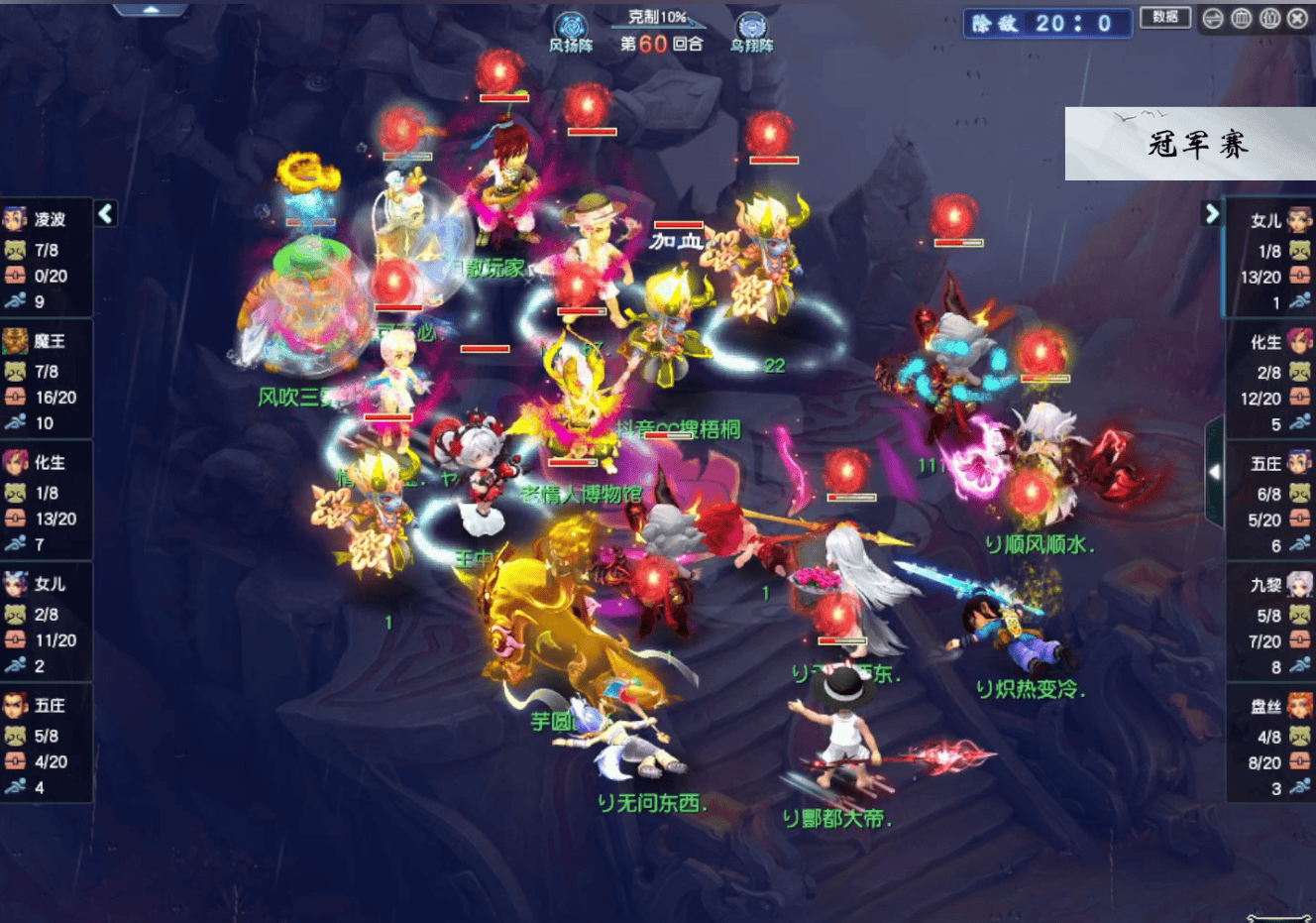 比赛第20回合,钓鱼岛凌波城再度出手,一度将珍宝阁盘丝、五庄血量打残。不过,由于珍宝阁成功控住钓鱼岛魔王寨的蓝量,勉强逃过一劫。
