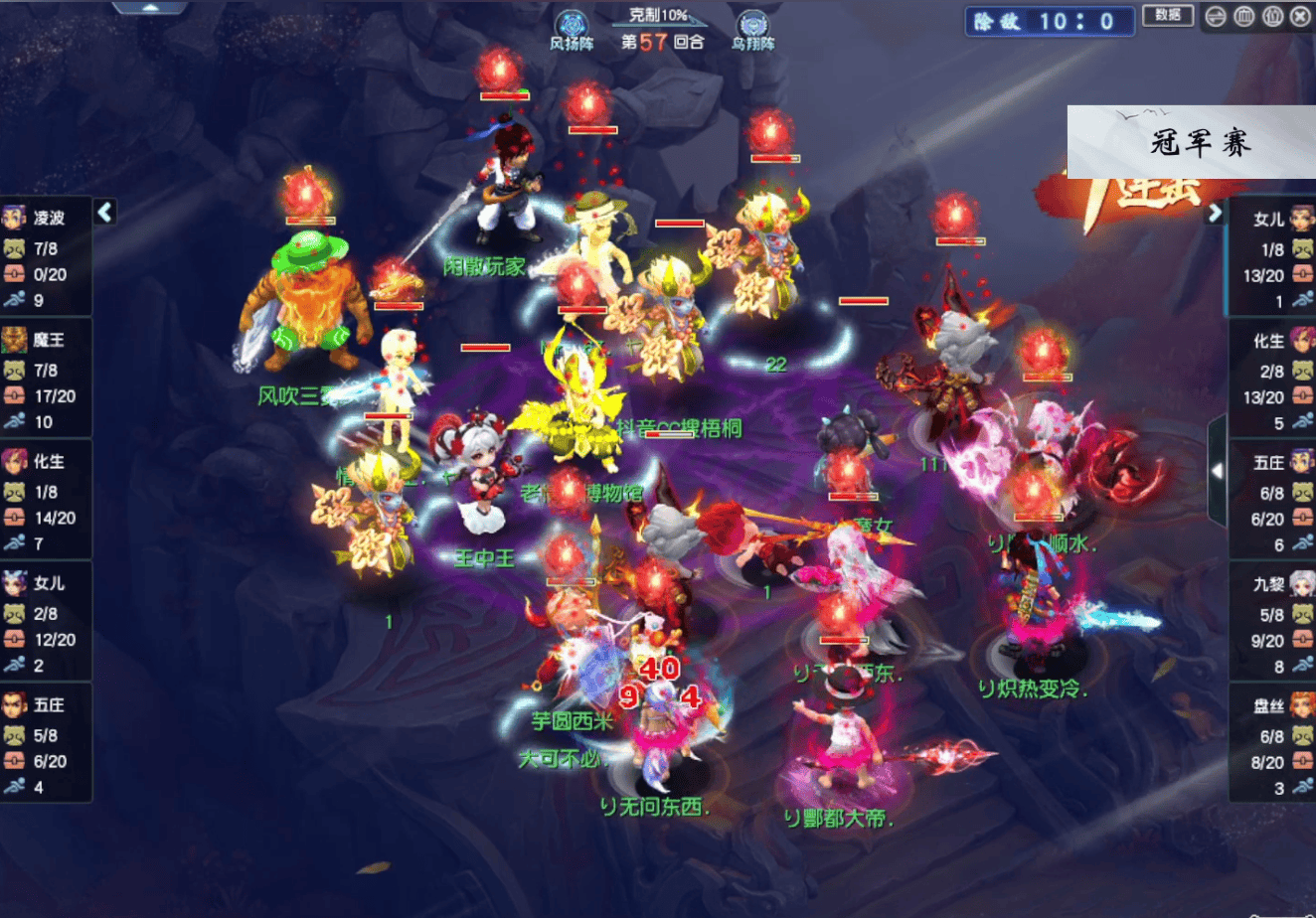 比赛第57回合,钓鱼岛凌波城一马当先,使用破血狂攻打出9404点伤害,直接点掉珍宝阁盘丝,令其无法继续控蓝。