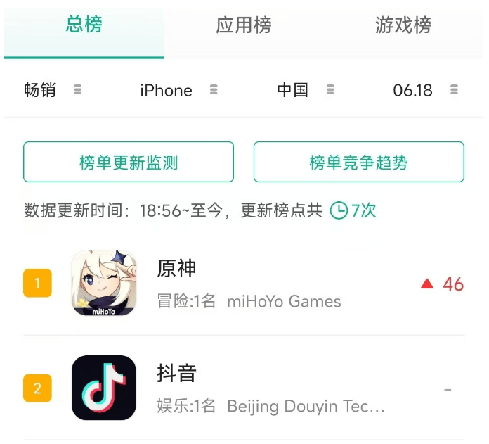 6月18日,《原神》在更新了新版本之后登顶了畅销总榜。截至发稿,它仍然保持在游戏畅销榜TOP 1。