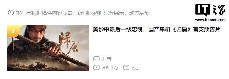IT之家 6 月 20 日消息,国产动作冒险单机游戏《归唐》今日上午发布了第一条预告 PV,瞬间成为单机游戏玩家关注的热点,登上B站全站排行榜第一名,并入选了“第 326 期每周必看”名单。