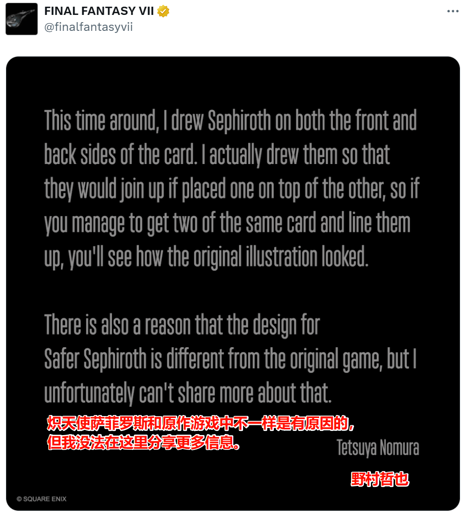 不久前,《最终幻想7》重制版经历了一次“剧情偷跑”——玩家们发现一张由游戏总监和美术负责人野村哲也亲自绘制的萨菲罗斯卡牌,上面的萨菲罗斯和《最终幻想7》重制版里没有右手的设定不符。