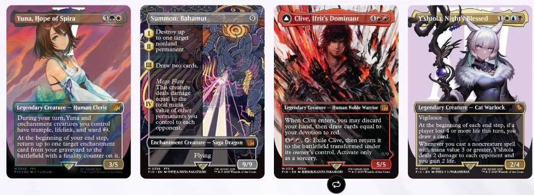 上周末,联动正式发售。和很多只是推出几套服装/皮肤的游戏联动不同,这是一次实打实的重磅联动,万智牌拿出了300多张牌的一整个新系列,覆盖了从1987年首部《最终幻想》到2023年发售的《最终幻想16》在内的所有正传作品,囊括了历代作品中的代表角色、召唤兽、标志性场景和道具。