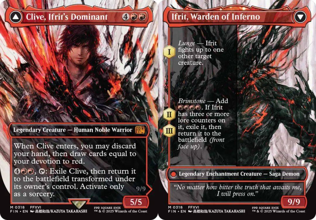 这次联动里,这样的双面卡牌挺多,像是《最终幻想16》中的克莱夫,只要支付足够法术力,就可以变身伊芙利特,获得强大的能力,身材也从5攻5防变成9攻9防,而等3回合一过,伊芙利特又会变回克莱夫本人。这一设计还原了《最终幻想16》中“召唤兽寄宿在人类身体”的设定,也把游戏中克莱夫一次次痛苦挣扎唤醒伊芙利特的剧情自然而然地融进了玩法中,相当巧妙。