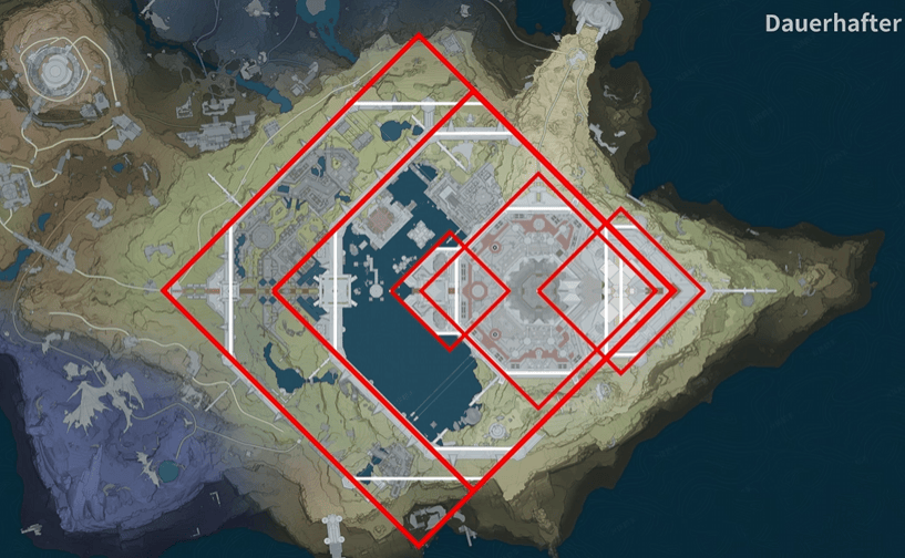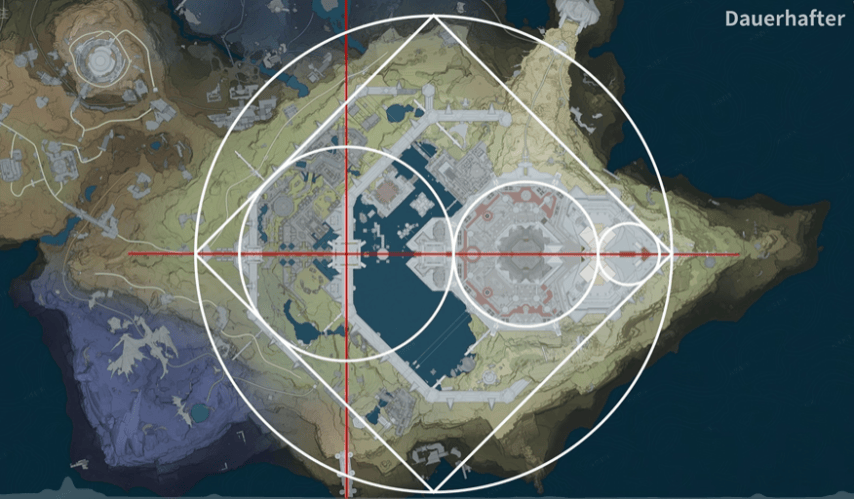 不仅如此,七丘地图设计还运用了大量的正方向、六边形和八边形,比如最为明显的主城核心区就是一个正八边形,而主城的两道城墙则是普通八边形,城墙上的门楼和城区的柱头是正六边形,而城区主入口和总督宫则为普通六边形,充满了设计美感。