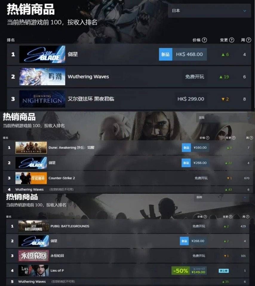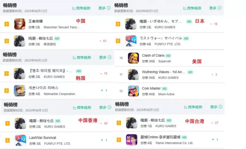游戏在中国大陆跻身畅销总榜第二,同时在中国香港、中国台湾地区以及日韩市场实现一波登顶,连续两个大版本突破了自身畅销成绩的最佳纪录。即便是在最难突围的北美,《鸣潮》也冲到了总榜第38名,几乎追平了开服以来的最好成绩。
