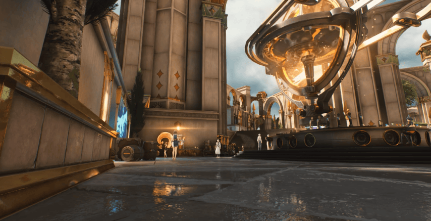 以卡庇托山城为例,其占地面积远超拉古那城数倍之多。这些新增的面积被用于将建筑比例进一步放大。阳光穿透云层洒在宏伟的大型建筑群上,高大的石柱在逆光中投下庄严的阴影。这里的一切场景建筑,仅需一眼,便足以令人心生宏伟之感。