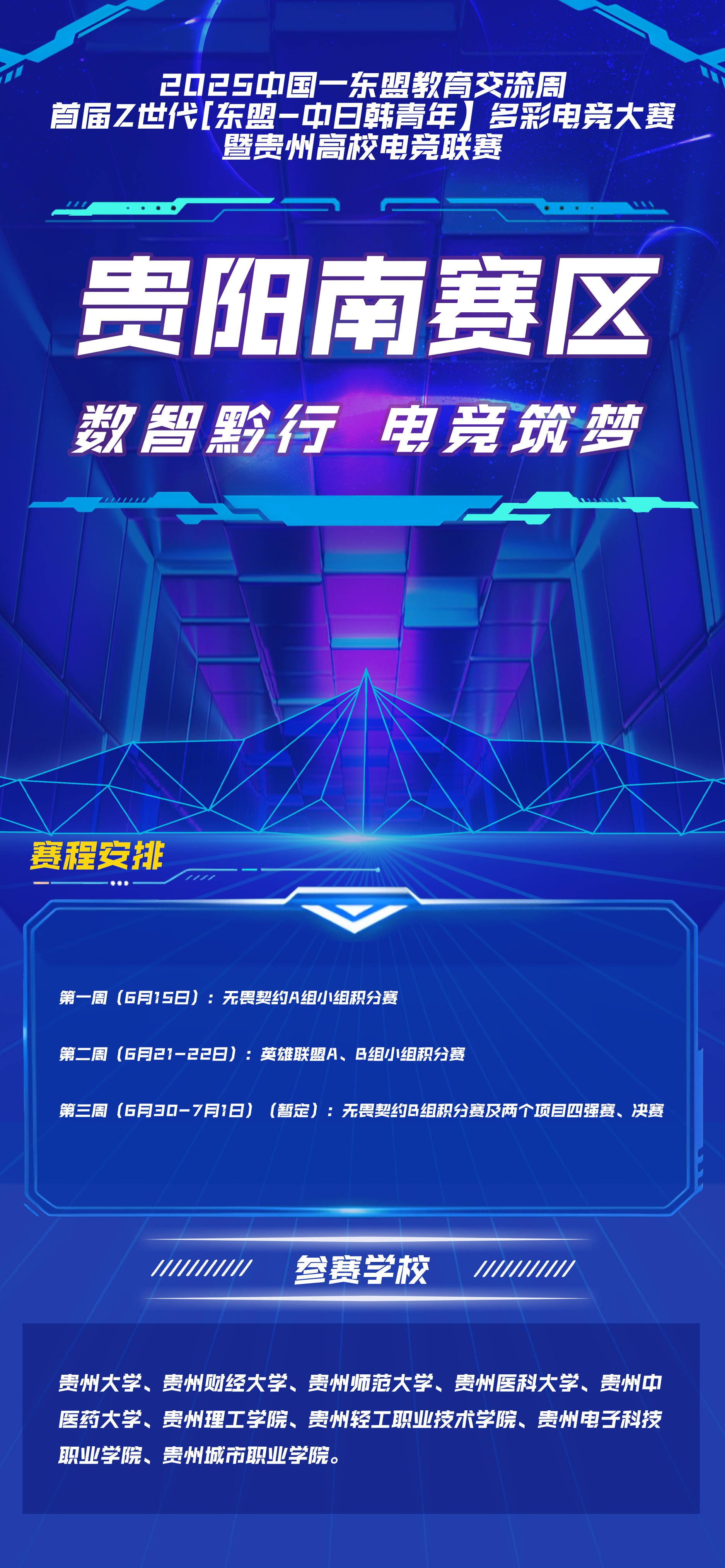 贵阳南赛区的比赛于2025年6月15日至29日,分三周有序进行,比赛地点位于贵阳市电子竞技运动行业协会(贵安新区大学城)。此次共有9所高校参赛,英雄联盟项目有14支队伍,无畏契约项目有14支队伍。