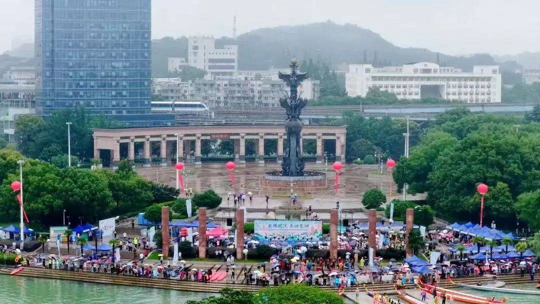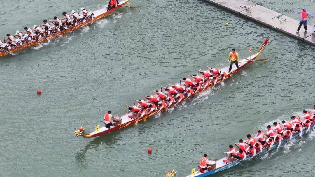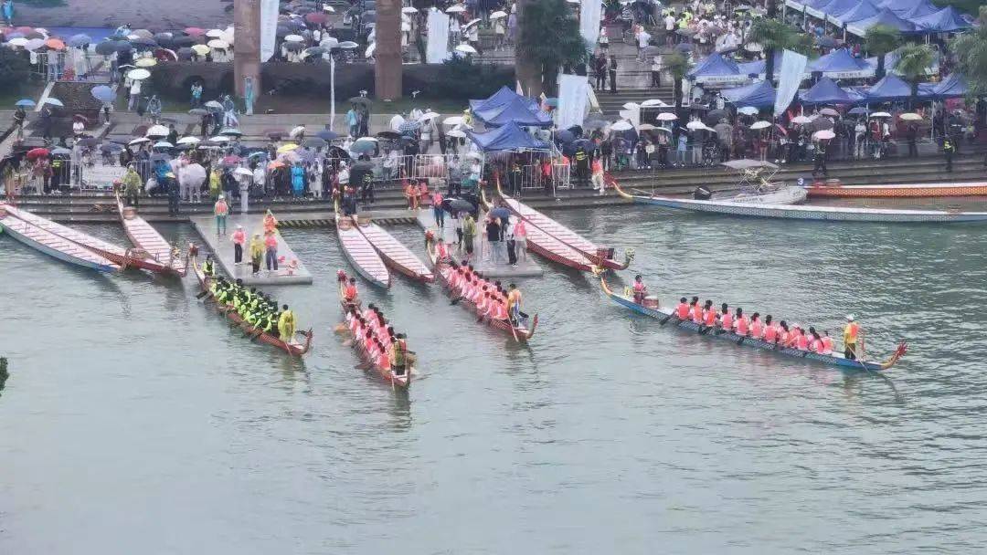 现场欢呼声、加油声震耳欲聋,连天上的雨都被这氛围 “嗨” 得越下越欢!这场龙舟赛,在雨幕中激荡起青春的风采,绽放出传统文化的活力。它不仅延续了传统,更展现了新时代的创意与激情。