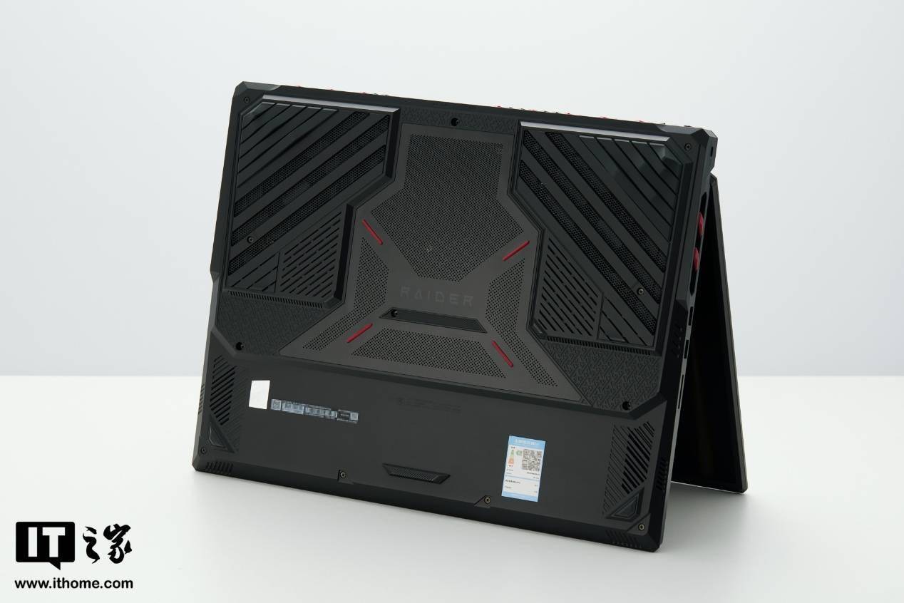 D 壳的设计霸气十足,无论是上方脚垫还是散热进气开孔都做成了斜切设计,中间还有后一大块独立的开孔区域,上面印着 RAIDER 的字样,下方两侧还有 2 个扬声器开孔,整机实际配备了 6 个丹拿调音的扬声器阵列。