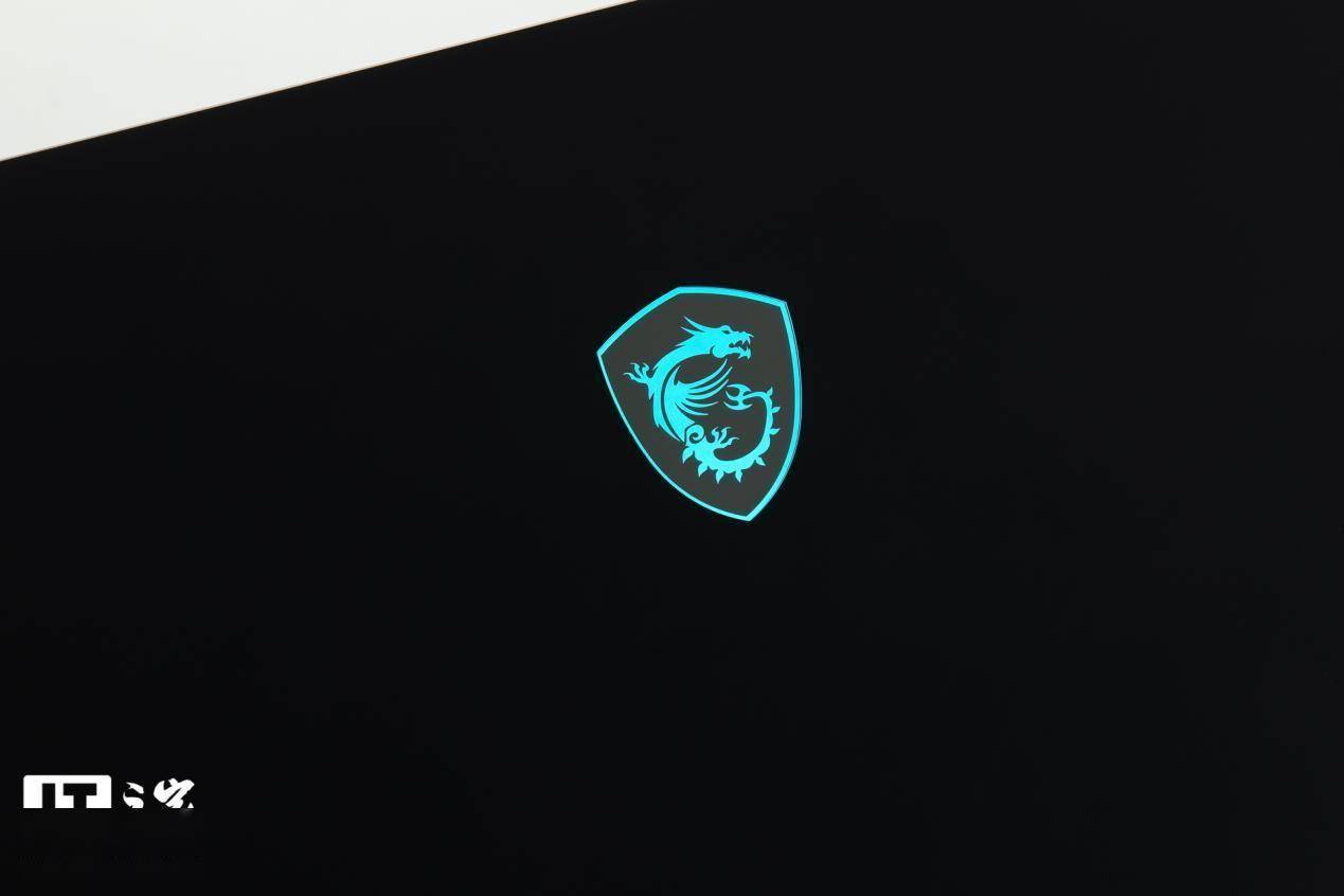 机身 A 面为磨砂金属材质,手感顺滑。上部分居中位置有一个亚克力上盖的微星龙盾铭牌,开机后就会亮起 RGB 氛围灯,彰显其尊贵的旗舰属性。