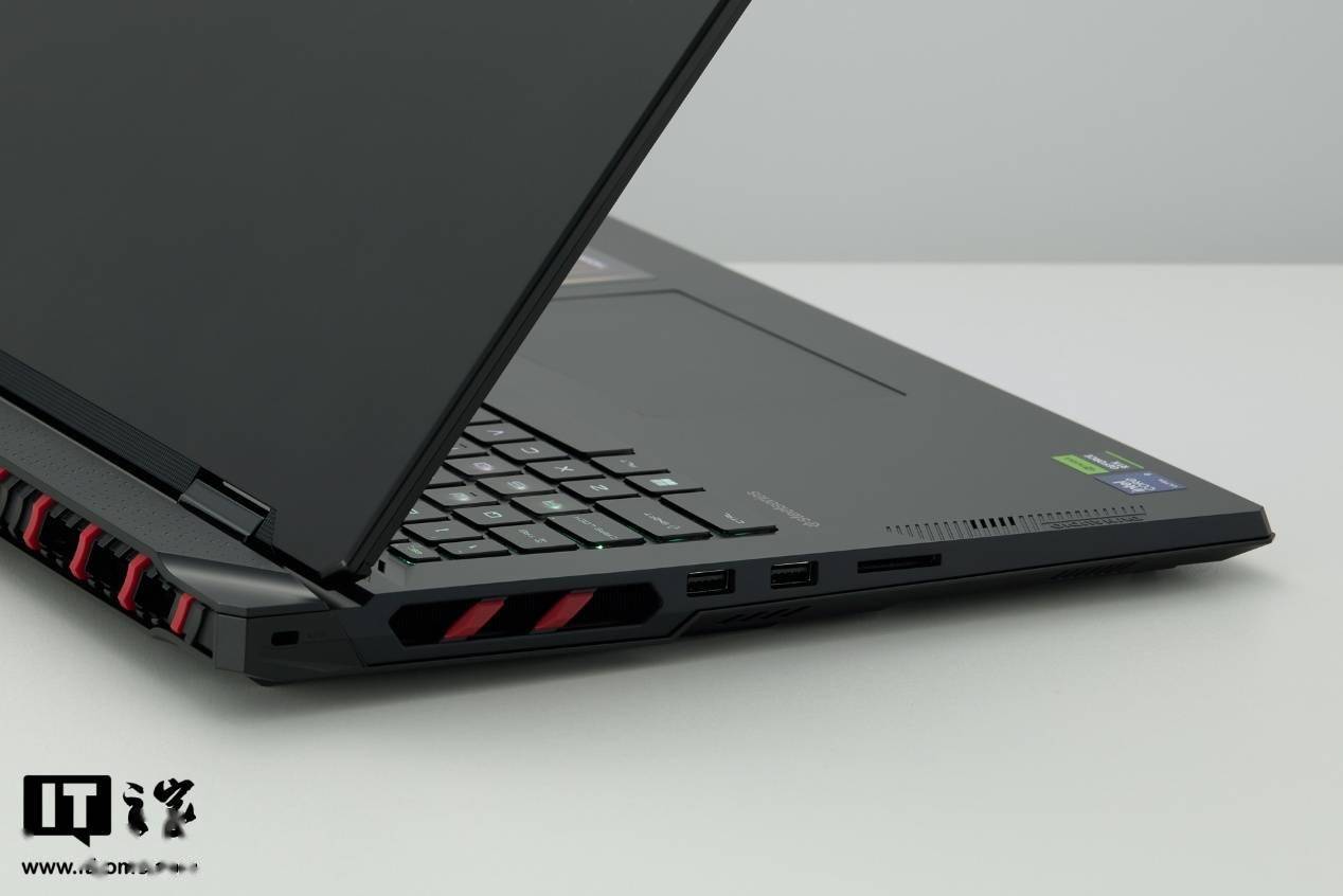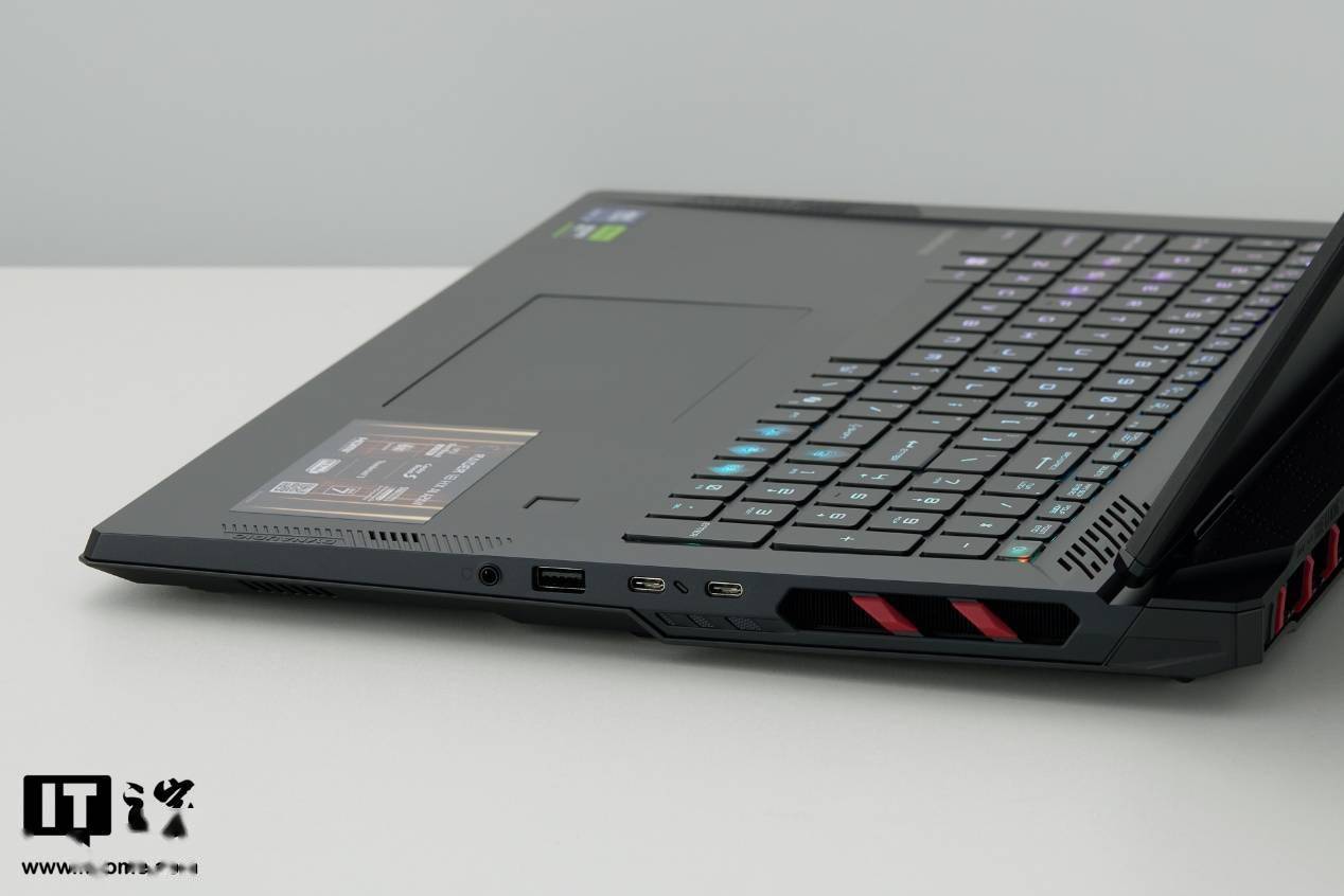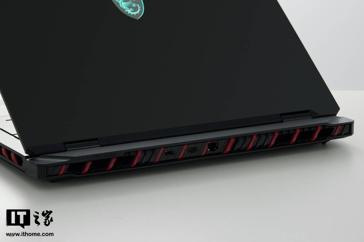 微星泰坦 18 Pro AI 2025 整体采用黑色涂装,尾部出风口、侧边出风口和尾部接口区域做了红色的斜切条带装饰。