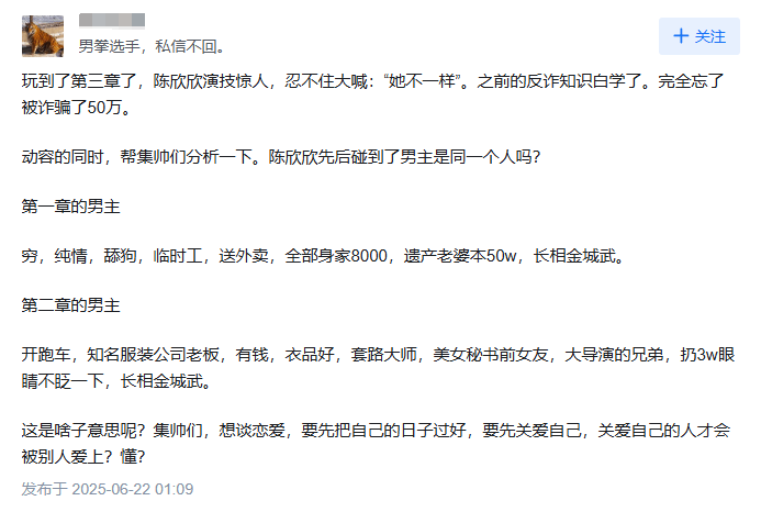 不过,也有玩家在真正体验《捞女游戏》后产生了“被诈骗的感觉”,名为“捞女游戏”,实则“男主爽文”。