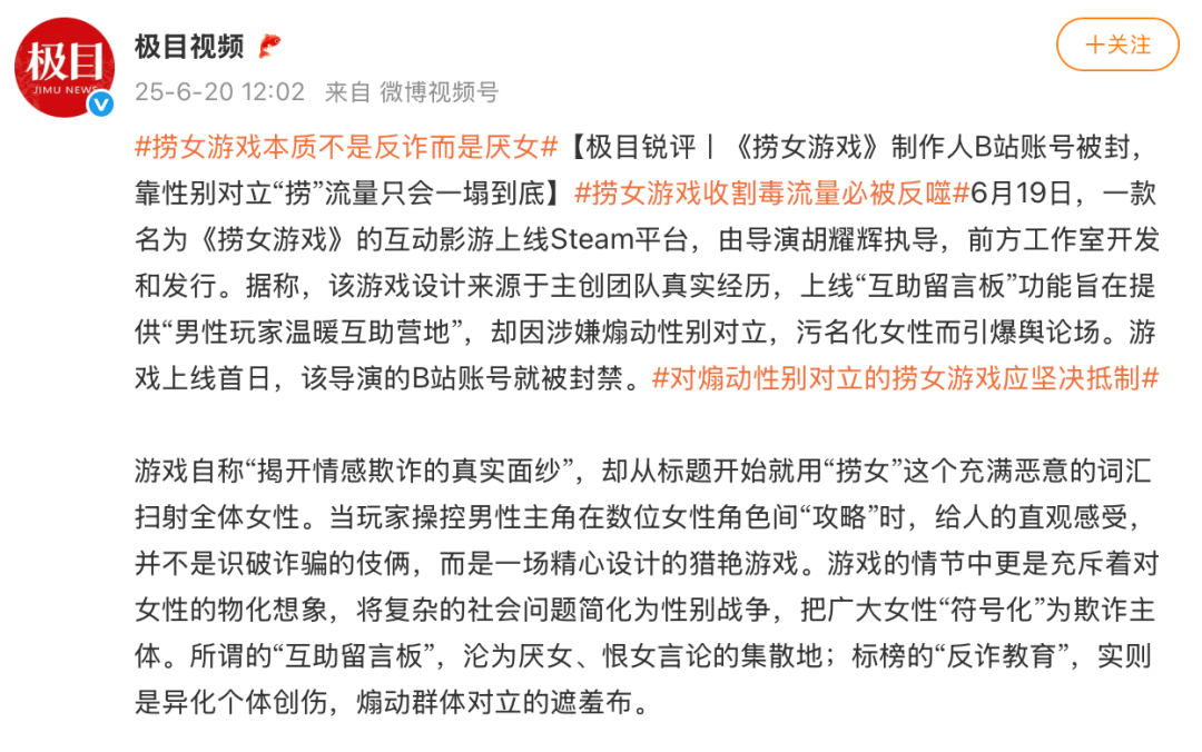 对此,一部分网友认为“捞女”一词充满恶意,扫射了全体女性。6月20日,极目新闻发文称:捞女游戏的本质不是反诈而是厌女。