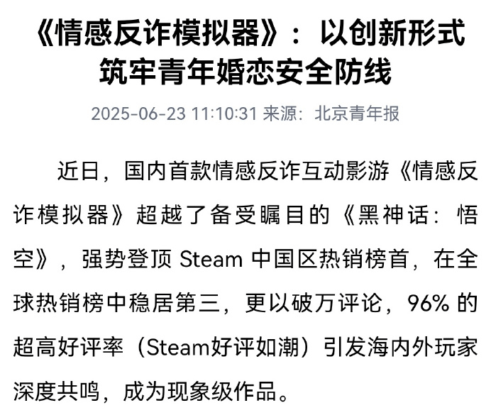 6月23日,北京青年报发文更是公开表扬,称该游戏“通过互动叙事手法,抽丝剥茧地拆解情感诈骗、PUA操控、经济勒索等现实陷阱,将游戏打造成一堂生动深刻的反诈公开课。”