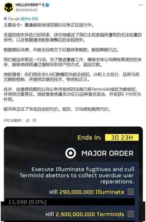 开发商Arrowhead在任务简报中宣布:“超级地球的重建工程已全面展开。完整损失评估报告显示,我们的母星遭受了难以估量的创伤——包括通货膨胀调整后的天文数字维修费。”为筹措资金,玩家需执行“强制资产没收”行动,即在不到一周时间内歼灭2.9亿光能者敌军与29亿虫族。