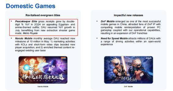 据腾讯2024年Q1、Q2财报及业绩演示信息显示,同在搜打撤成功收割射击玩家的时段,《和平精英》正处于增长突破的瓶颈期。其中2024年Q1财报指出产品“因2023年下半年商业化内容较弱”而录得了一次收入的同比下降;2024年Q2业绩演示则提出,得益于地铁逃生玩法推出,产品在7月“恢复”同比增长。