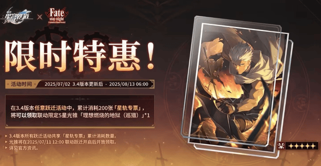这次Fate联动跃迁卡池将长期开放,Saber和Archer的卡池共享保底次数,值得一提的是,3.4版本任意卡池抽卡,累积消耗200张星轨专票,就可以免费领取Archer的5星光锥“理想燃烧的地狱”。