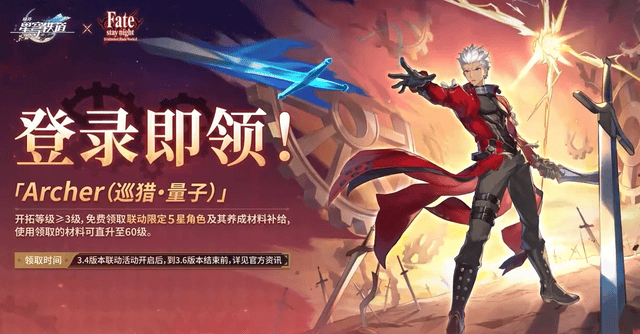 为了这次Fate的联动,星穹铁道官方也是给足了玩家诚意。先是公布登陆即领联动限定5星角色Archer(红A),还附赠养成材料补给,使用材料可直升至60级。