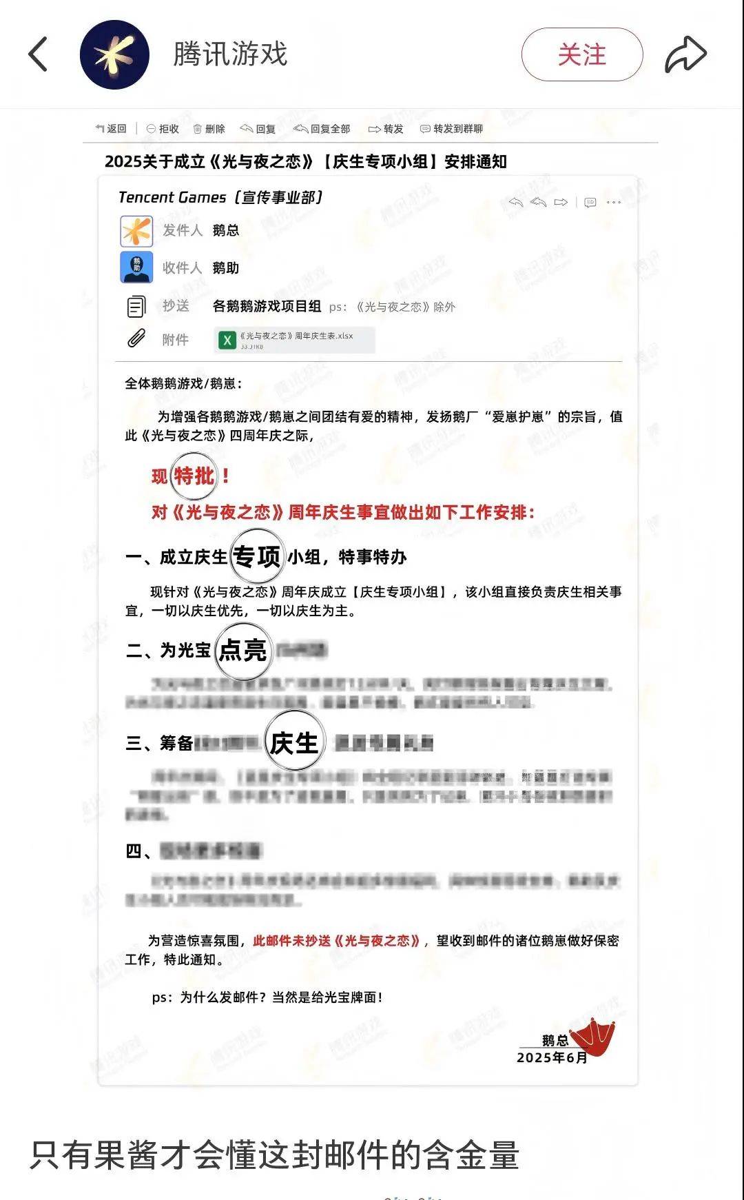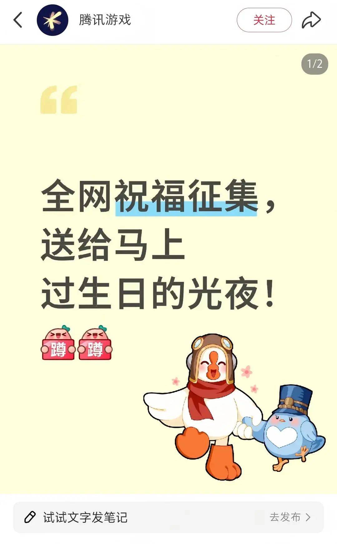 腾讯游戏在小红书、微博等社媒平台上,连发好几篇帖子为《光夜》庆生,把为《光夜》征集祝福的帖子置顶,还在广州塔准备了投屏;