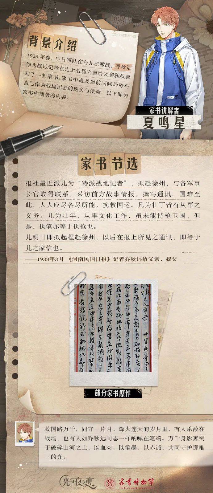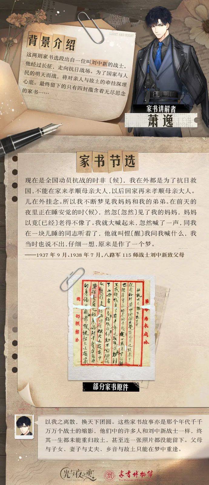 对于国人来说,这种珍爱和平、交接反侵略火种的感受,其实相当好代入和理解,毕竟列强的的确确践踏过我们生活的土地。在卡池之外,《光夜》也与中国人民大学家书博物馆合作,向玩家展示了反侵略时期的部分家书内容。