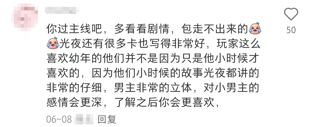 这也反过来说明,《光夜》玩家非常乐于关注这款游戏的相关动态、动作。不光是游戏内容更新,不光是在游戏圈内——看到别人提《光夜》,或是《光夜》去别人那儿露脸,玩家们都会感兴趣去了解,并留言聊聊自己的想法。