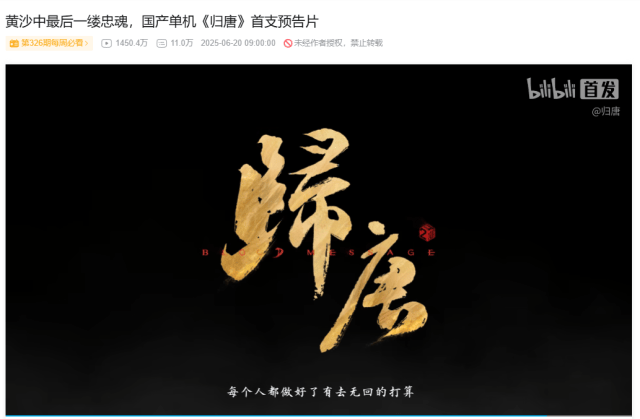 网易旗下临安24工作室推出的一款单机游戏《归唐》近期宣发了首个PV,瞬间成为游戏圈内外的焦点,这首发PV在24小时内就取得了1000万次的B站播放量,在抖音快手等短视频平台也收获超过2000万次的总播放量。