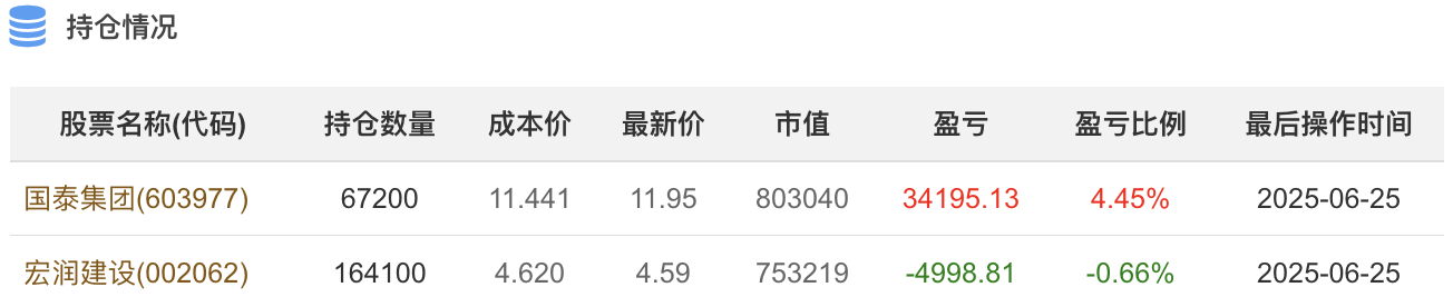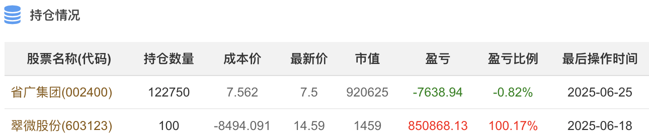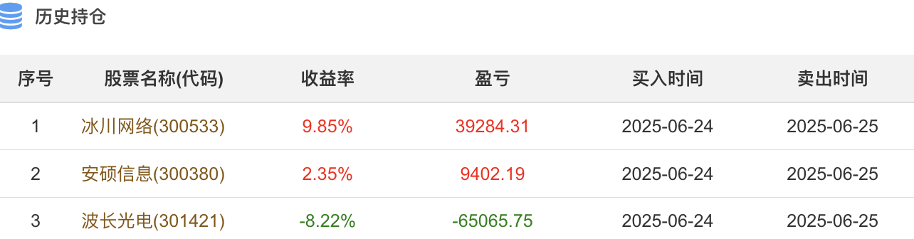@张阔 周二卖出逸豪新材,获得9.64%收益,卖出通源石油亏损。周二买入的冰川网络获得涨停,目前大赚8.43%。