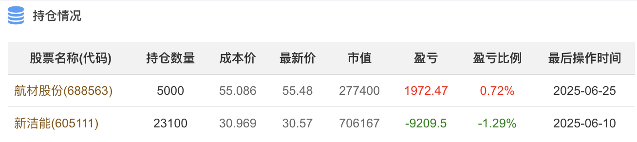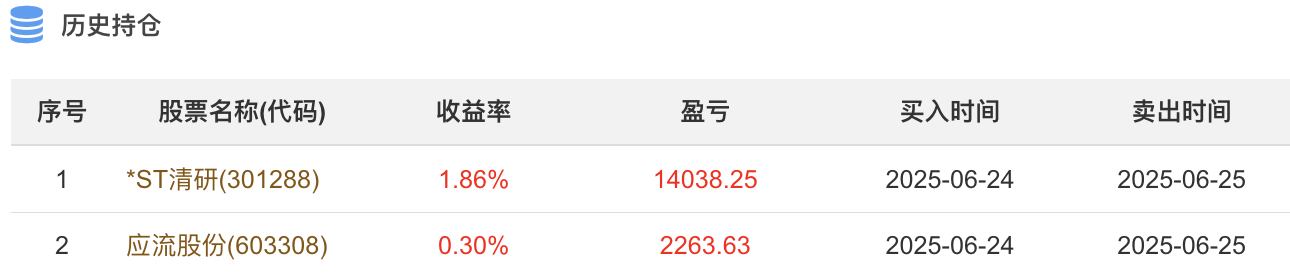 @秦时明月 周一卖出华谊集团,获得1.63%收益,随后暂空仓等待新机会。周二买入*ST清研、应流股份。
