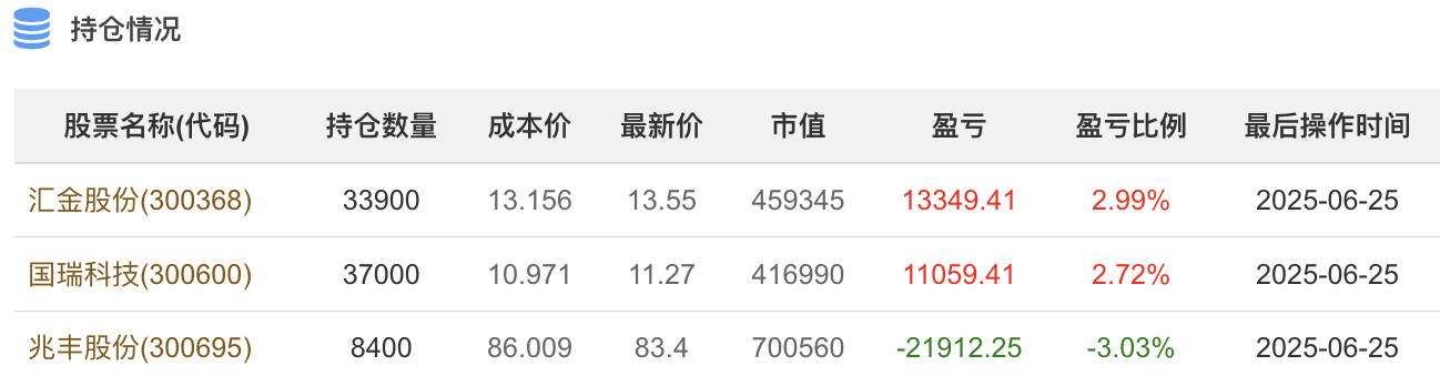 周三卖出冰川网络,最终获得近10%收益,目前持有3只股,其中汇金股份获得涨停,盈利近3%。周三张阔比赛收益为44.82%排第二。