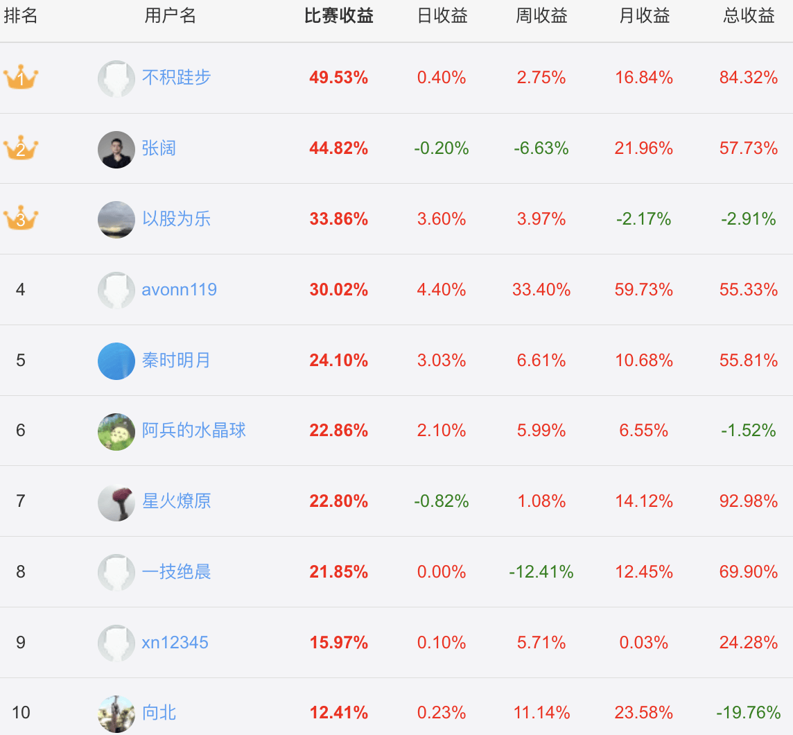 周三@不积跬步 的省广集团具上涨0.4%盘中已卖出部分仓位,比赛收益49.53%保持第一。@张阔 卖出冰川网络,最终获得近10%收益,目前持有3只股,比赛收益为44.82%排第二。@以股为乐 卖出先进数通盈利5.58%,买入信达证券,看好券商股机会。