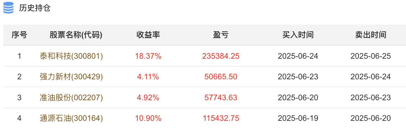 @avonn119 周一卖出准油股份盈利近5%,随后买入强力新材,再盈利4.82%。强力新材具备半导体封装+光刻胶+PCB概念等热点题材,走势开始加速上涨。