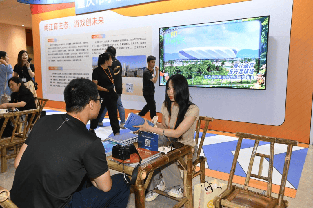 ▲客商在两江新区游戏产业展板处交流。冉雨琳 摄