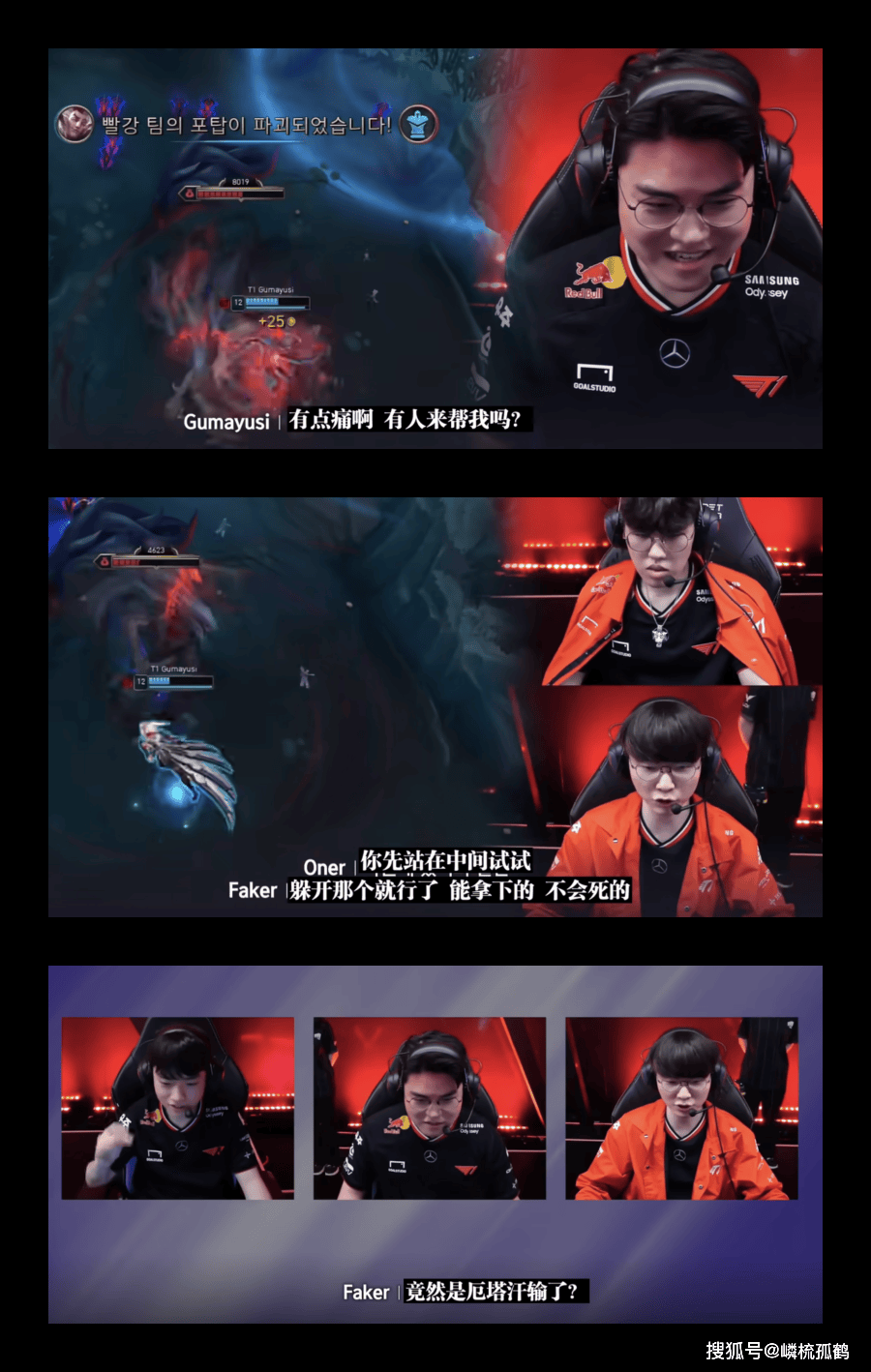 5、gumayusi在单人solo厄塔汗的时候差点被厄塔汗给做掉了,他还询问能不能有兄弟来帮下,结果其他几人只是口头建议他躲着内圈和外圈打,看到gumayusi成功拿下厄塔汗,Faker调皮的来了一句: