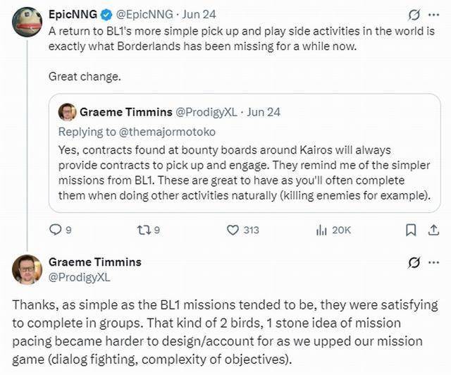 近日Timmins在推上与玩家互动,他确认《无主之地4》将提供类似《无主之地1》那样随机任务,玩家可在凯洛斯星球的悬赏板上承接。