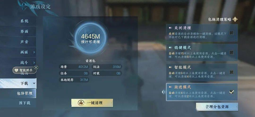 2、新增【极致清理】功能,对部分需要对存储空间进行极致清理的玩家,可将清理模式调整至【激进模式】,同时点击一键清理,可一键删除游戏内所有往期内容(含场景,剧情,玩法,时装等),不影响当前赛季体验。同时清理完成后可将模式切换为其他模式,不会再下载相关内容。
