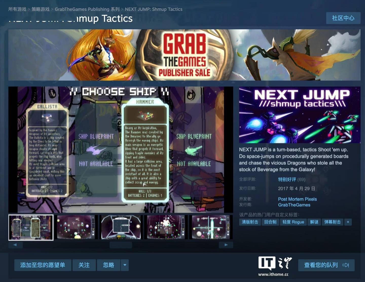 IT之家 6 月 27 日消息,开发商 Post Mortem Pixels 旗下射击游戏《NEXT JUMP:Shmup Tactics》现已在 Steam 平台迎来免费领取活动,游戏在 Steam 国区定价 18 元,7 月 2 日凌晨 1 点前用户可免费领取,IT之家附游戏商品页(https://store.steampowered.com/app/624690/NEXT_JUMP_Shmup_Tactics/?l=schinese)。