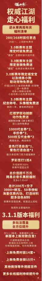 转眼间那么快,逆水寒手游就在6 月 27 日开启全新的3.0赛年,大家不仅可以体验到量大管饱的游戏内容,还能畅享 288 自选时装(29款任选)、新赛年主题限定时装、新赛年主题限定坐骑、新赛年限定宠物、自选金色/紫色打造、多张半价券和 1000 纹玉代金券等福利。