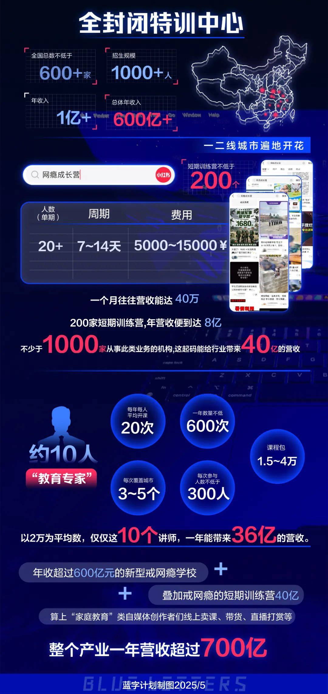 年收超过600亿元的新型戒网瘾学校,叠加戒网瘾的短期训练营40亿,再算上“家庭教育”类网红大V的演讲与线下训练营,以及自媒体创作者的线上卖课、带货、直播打赏等收入,整个产业一年营收超过700亿。